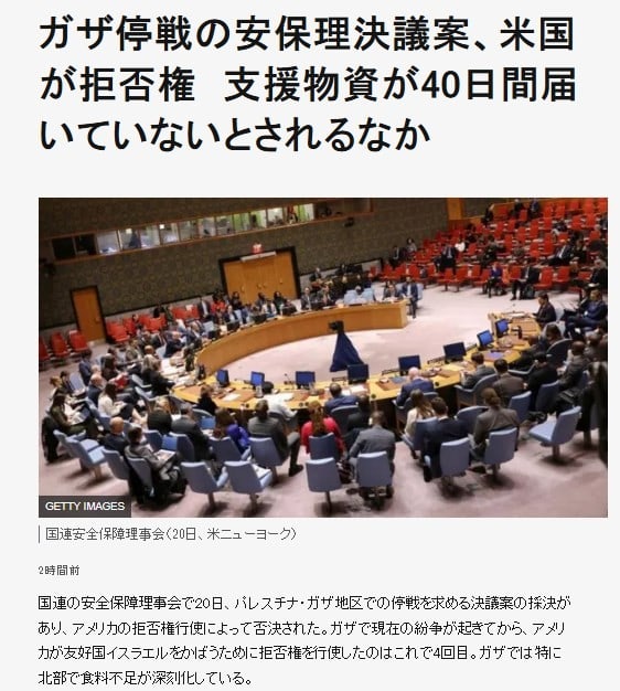 この1週間、ガザの停戦について協議が進められていたのですが、また米国は停戦決議案を拒否しました。一体これらの重大な決断は「民主主義に基づいて米国民の総意として決められた」と言えるのでしょうか。フクヤマ氏の見解を聞きたいものです。