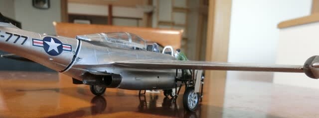 余計な事をせずに単に206番を筆塗りするだけでもきれいなアルミ感が出るのかもしれません。雪のアラスカ地方で墜落しても目立つように翼を派手なオレンジ色で塗装した機体も見かけますが、今回は割と地味なシルバーと黒の機体です。朝鮮戦争で活躍したF-80と並べました。F-89の機体の大きさが分かります。ヒトは付いてなかったのでハセガワのアメリカ空軍乗員セットから流用しました。